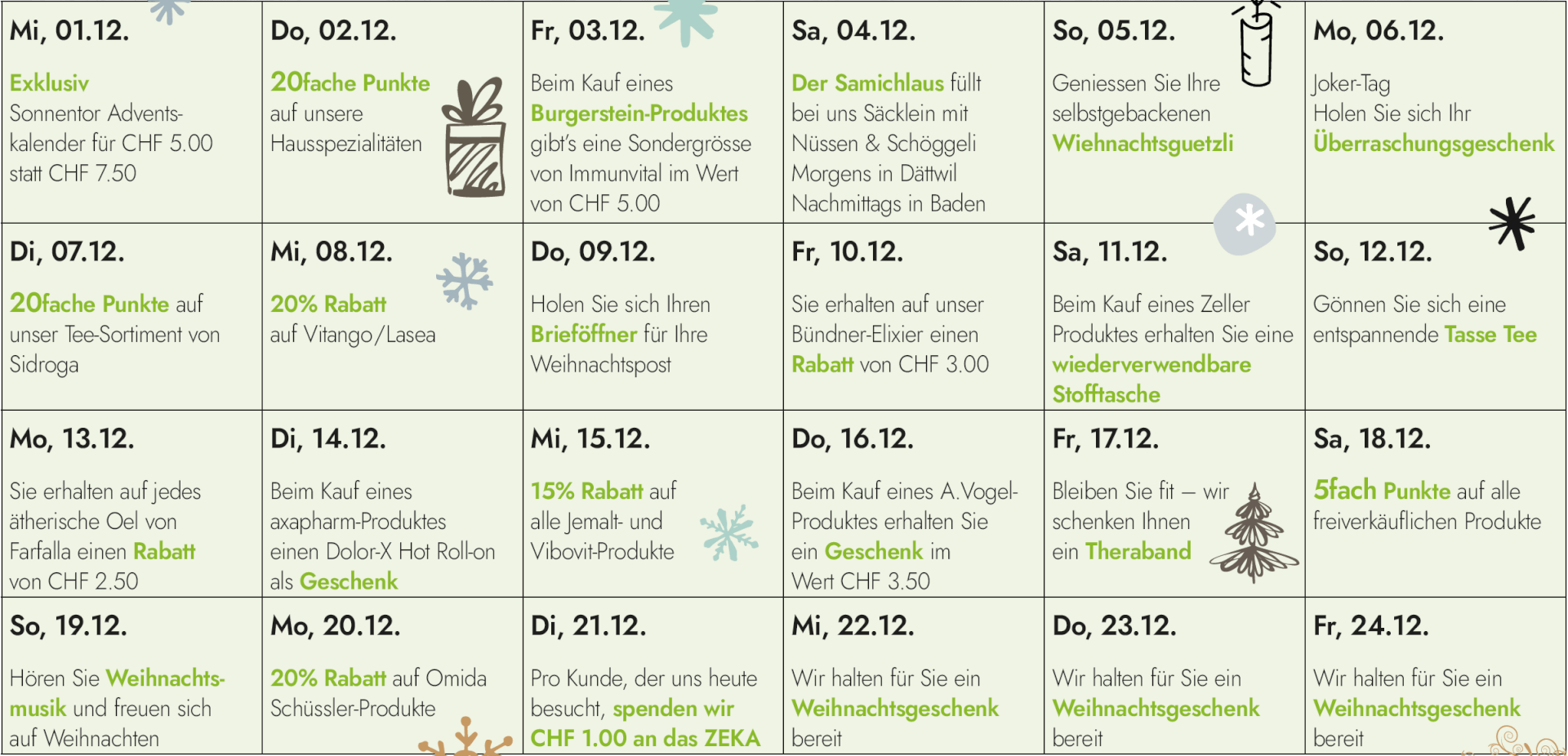 Der Apotheke Wyss Adventskalender hat keine Fensterchen zum Öffnen, sondern besondere Angebote und Geschenke, die wir Ihnen bei einem Besuch in Baden oder Dättwil gerne anbieten. Sie können sich rauspicken, was Ihnen gefällt.