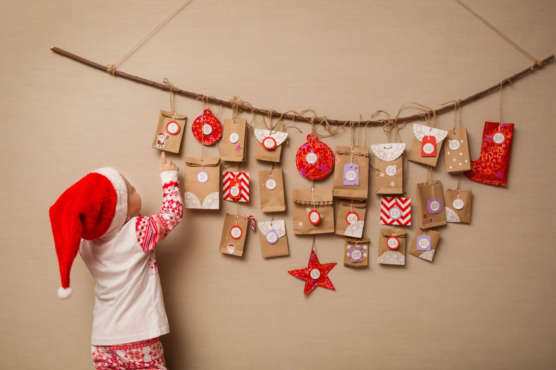 Ein Kind in festlichem Schlafanzug und mit Weihnachtsmannmütze greift nach einem handgefertigten Adventskalender, der an einer Wand hängt. Er besteht aus braunen Papiertüten, Ornamenten und Schnur, die an einem großen Holzstab befestigt ist.