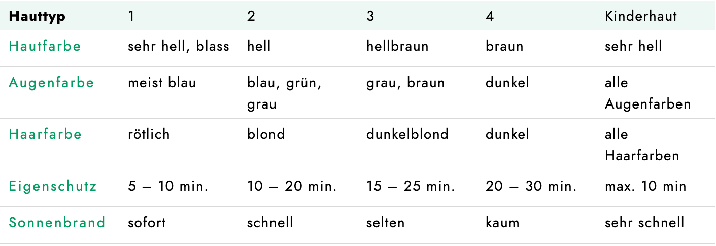 Ein Jugendlicher mit einem Hauttyp 1, der eine Sonnenlotion mit SF 30 verwendet, hat nach 150-300 Minuten sein «Sonnenkonto» aufgebraucht und sollte unbedingt aus der Sonne gehen – mit einer Sonnenmilch SF 50 beläuft sich das Sonnenguthaben auf 250 – 500 Minuten und der Schutz hält für eine grosse Wanderung.