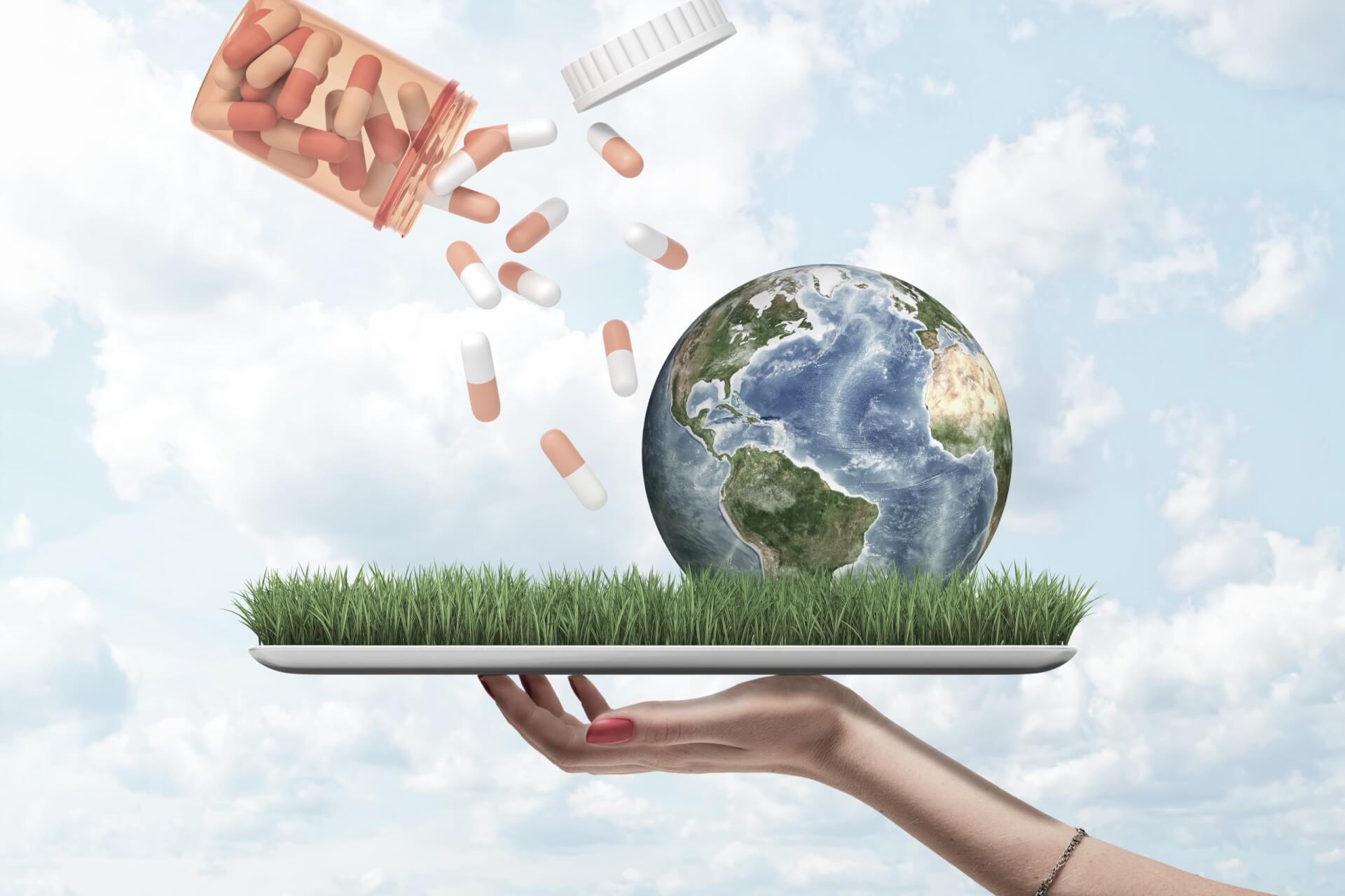 Eine Hand hält ein Tablett mit Gras, einen Globus und Pillen, die aus einer offenen Pillenflasche fallen, vor einem wolkenverhangenen Himmel - als Symbol dafür, wie Antibiotika und ihre Verwendung die Welt und die Umwelt beeinflussen und zur Antibiotikaresistenz beitragen.