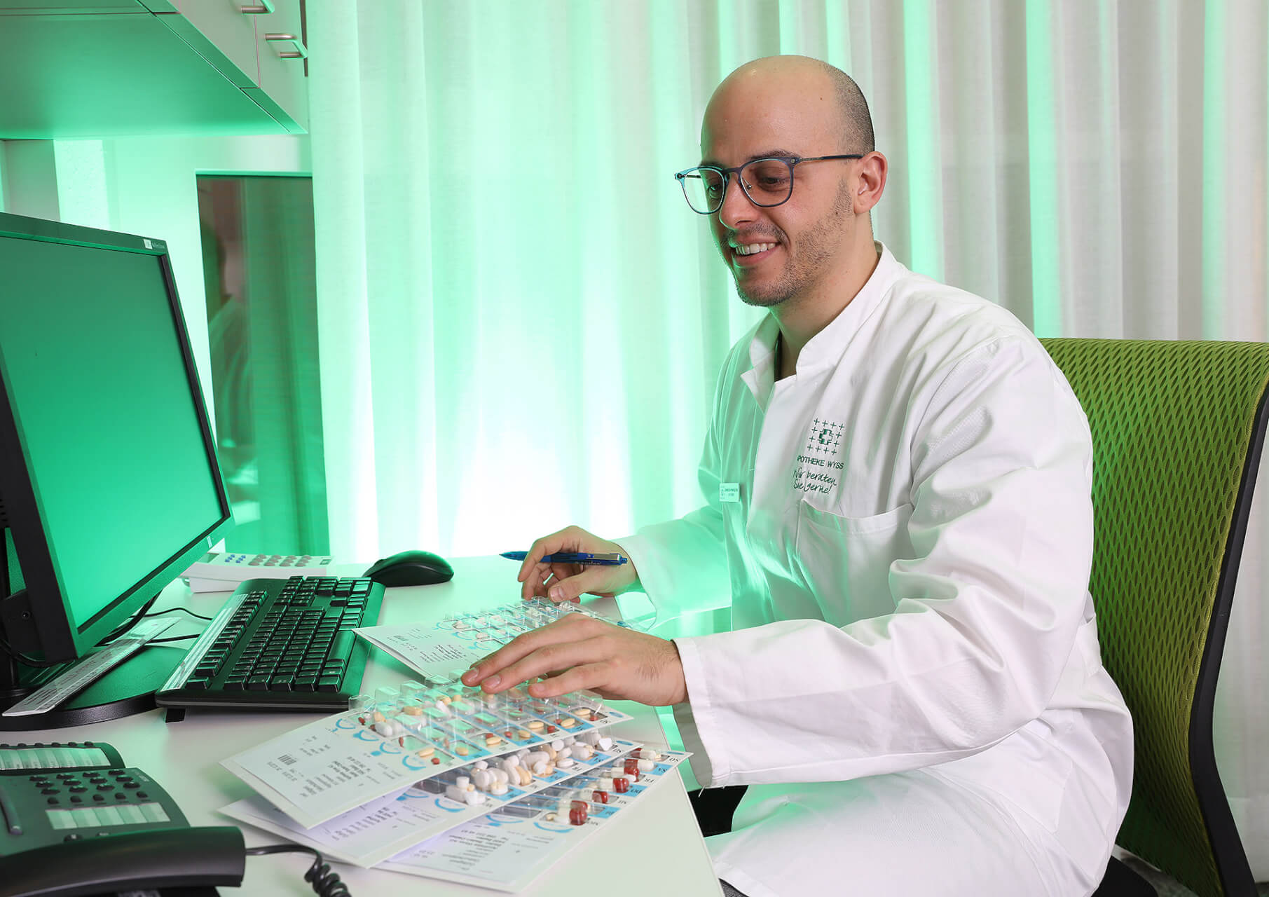 Unser Beruf ist sehr abwechslungsreich. Natürlich stehen in erster Linie unsere Kundinnen und Kunden im Vordergrund. Ob direkt in der Apotheke, am Telefon oder per Mail. Die Beratung und das Bedienen unserer Kunden macht etwa 90% unserer täglichen Aufgaben aus. Deshalb ist es sehr wichtig, dass man offen und kommunikativ ist und Menschen mag. Abgesehen vom Kundenkontakt fallen auch noch einige administrative Arbeiten an, wie zum Beispiel: