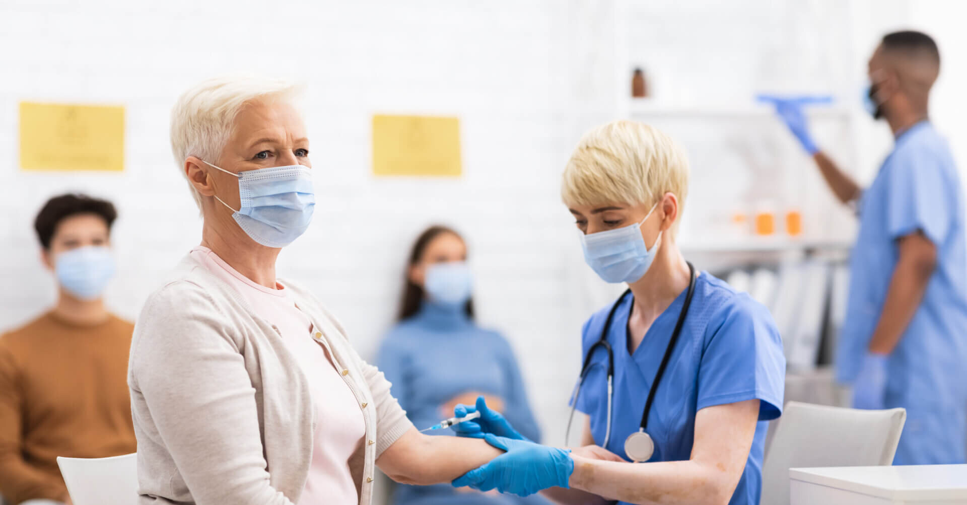 Eine medizinische Fachkraft in blauem Kittel verabreicht einer älteren Frau, die eine Maske trägt, eine Grippeimpfung. Andere Maskierte sitzen im Hintergrund, und eine weitere medizinische Fachkraft steht in der Nähe.
