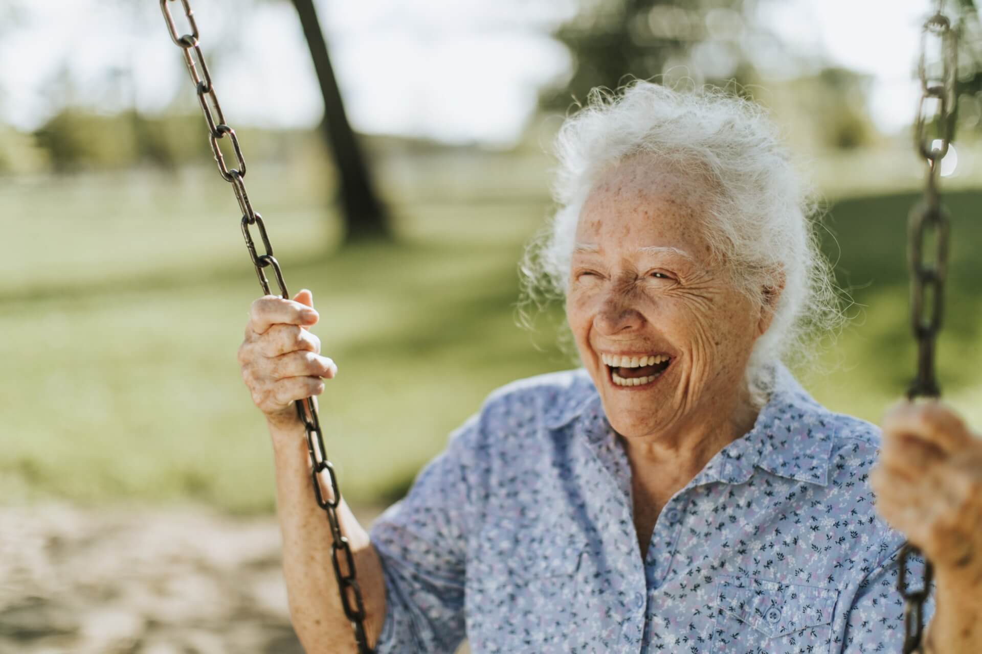 Eine ältere Frau mit weißen Haaren und einem blau gemusterten Hemd lächelt fröhlich auf einer Schaukel in einem sonnigen, grünen Park und spiegelt die Vitalität wider, die durch Altersmedizin und richtige Medikation im Alter unterstützt werden kann.
