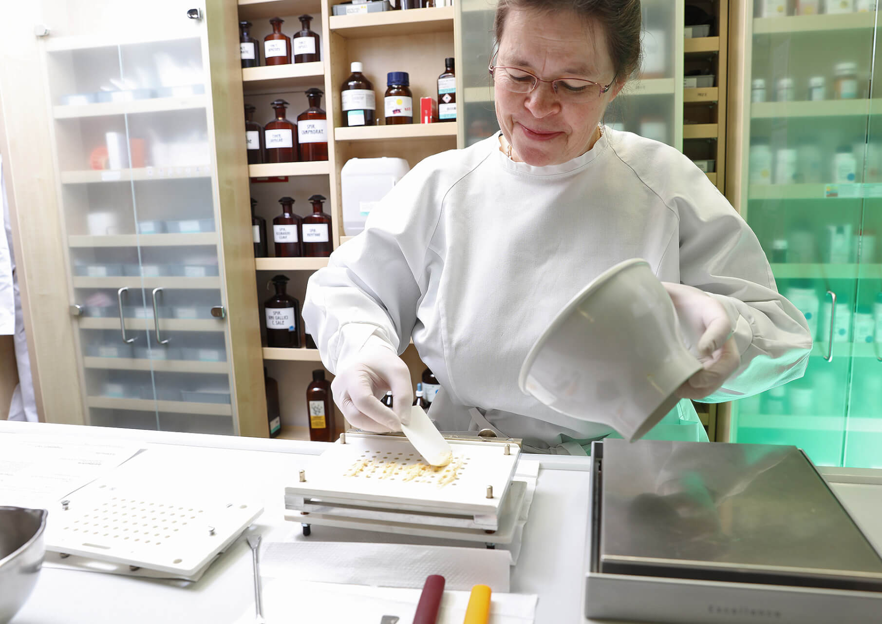 Ursprünglich gab es in der Apotheke nur wenig vorgefertigte Produkte – das Meiste wurde auf Verordnungen speziell hergestellt. Heutzutage ist das nicht mehr die Regel – dennoch können wir es noch und stehen täglich im Labor. «Die Dosis macht’s». Aus diesem Grund wird eine Herstellung plötzlich notwendig, damit die passende Stärke einer Substanz verwendet werden kann.