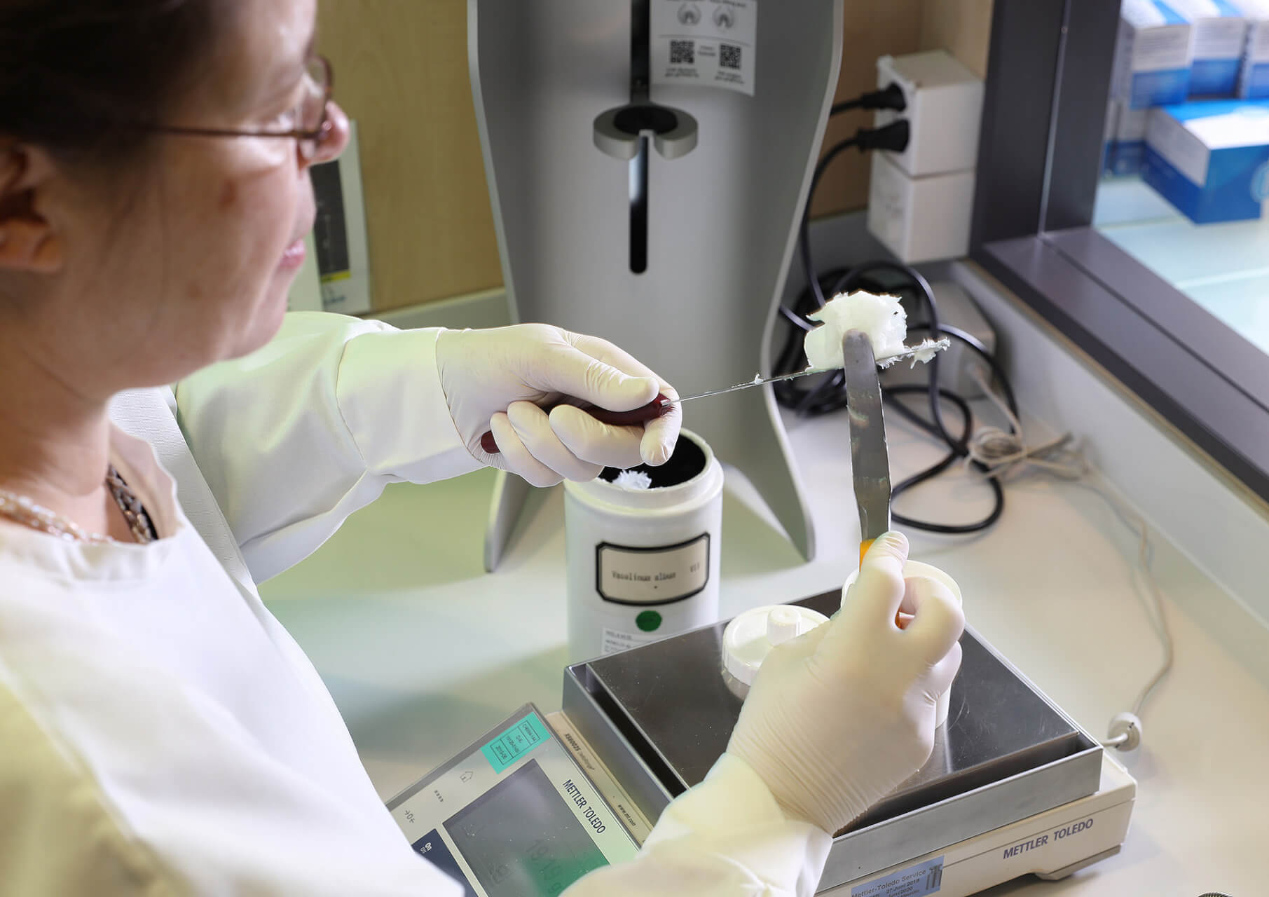 Eine lächelnde Person im Laborkittel und mit Handschuhen mischt in der Wyss Manufaktur Substanzen in einer weißen Schüssel mit einem Spatel, umgeben von Regalen mit Flaschen und Gläsern in einer Laborumgebung.